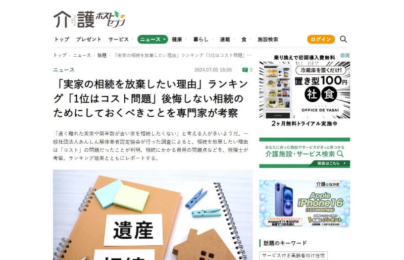 株式会社小学館が運営する介護情報サイト「介護ポストセブン」に当協会のプレスリリースが紹介されました。 ご紹介いただいた内容は実家の相続に関する意識調査で、実家の相続を放棄したいと思っている201人を対象にアンケート調査を…