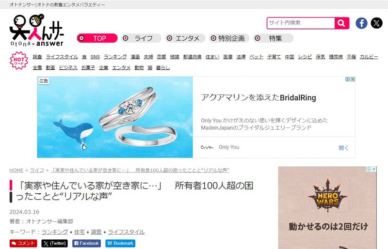 株式会社メディア・ヴァーグが運営する暮らしに話題と気づきをお届けするウェブメディア「オトナンサー」に当協会のプレスリリースが紹介されました。 ご紹介いただいた内容は空き家の放置理由に関する意識調査で、空き家を放置した経験…