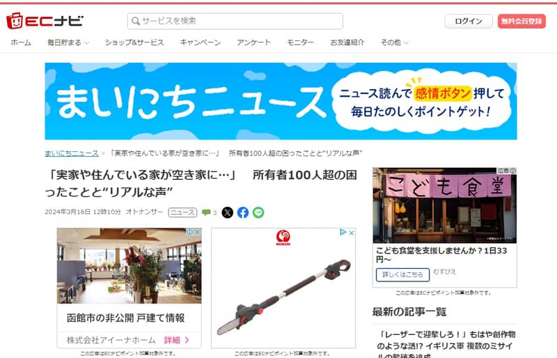 株式会社DIGITALIOが運営するポイントサイト「ECナビ」に当協会のプレスリリースが紹介されました。 ご紹介いただいた内容は空き家の放置理由に関する意識調査で、空き家を放置した経験がある118人を対象にアンケート調査…