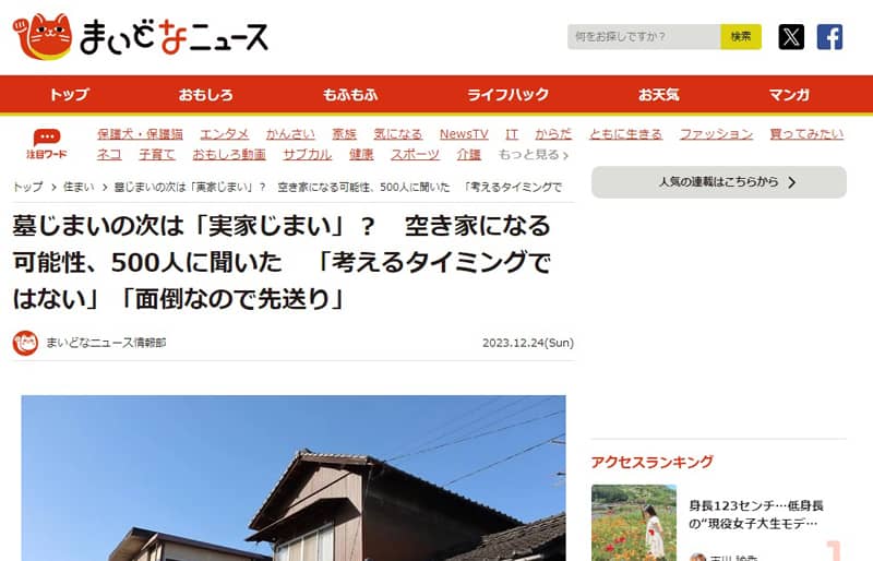 神戸新聞社が運営する関西発やわらかニュースサイト「まいどなニュース」に当協会のプレスリリースが紹介されました。 ご紹介いただいた内容は実家の空き家問題に関する意識調査で、実家がある男女500人を対象にアンケート調査を実施…