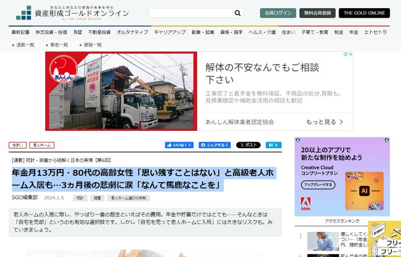 株式会社幻冬舎ゴールドオンラインが運営するあなたとあなたの家族の未来を守るための総合情報サイト「資産形成ゴールドオンライン」に当協会のプレスリリースが紹介されました。 ご紹介いただいた内容は実家の空き家問題に関する意識調…