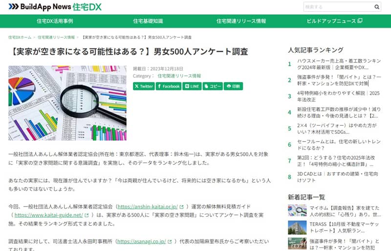 野原グループ株式会社が運営する「BIM」や「建設テック」に特化したニュースサイト「BuildAppNews住宅DX」に当協会のプレスリリースが紹介されました。 ご紹介いただいた内容は実家の空き家問題に関する意識調査で、実…